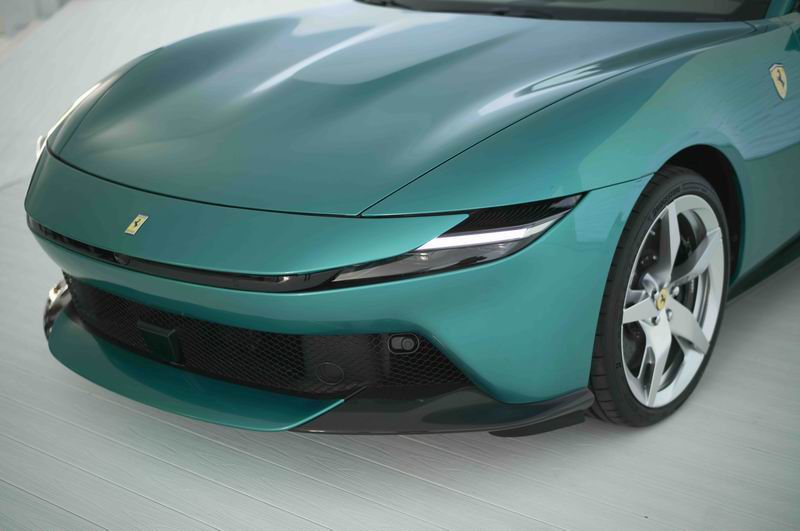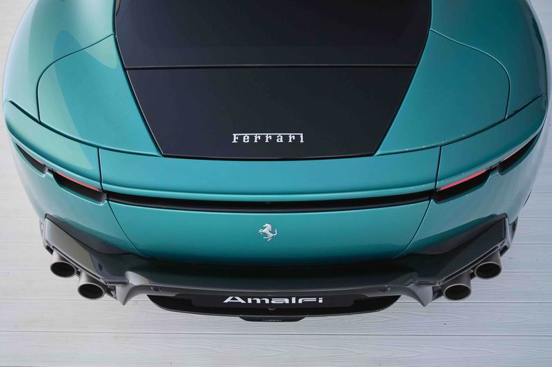 法拉利Amalfi 的外观设计灵感源自Speedform项目车型浑然一体的流线造型,赋予整车蓄势待发的动感姿态。新车的车身型面秉持纯粹至简的设计理念,利落的线条与充满几何美感的轮廓相得益彰,共同勾勒出富有雕塑美感的流畅车身。新车前脸摒弃了传统的格栅设计,转而在深色的凹条上方布局一个与车身同色的悬浮式前翼,而大尺寸进气口与修长立体的发动机罩构成了新车前部的视觉焦点。车尾则由一条醒目的线条环绕,勾勒出干净利落、简约凝练的轮廓。此外,锻造轮毂与碳纤维细节则为整车造型增添一抹动感气息与精致美感。为彰显独特个性,新车的首发配色Verde Costiera以阿马尔菲海岸的粼粼波光为灵感,这一闪耀的蓝绿色调在车身型面上流转,既强化了雕塑美感,又为整车设计注入充满活力的灵动气息。