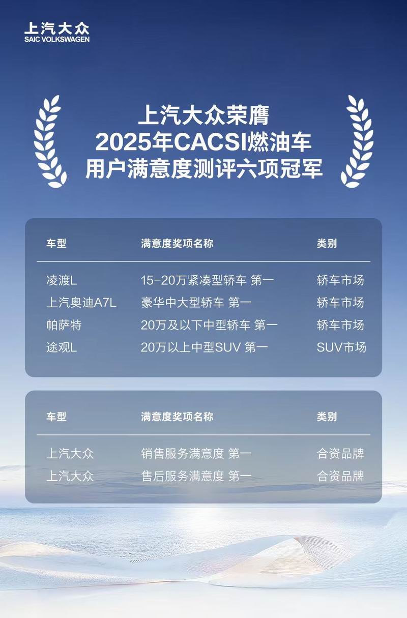 产品满意度多点开花,服务质量也备受肯定。上汽大众荣获合资品牌的销售服务和售后服务满意度“双冠”,依托的是其专业可靠、透明无界、及时响应的服务准则,让每一份信任都不被辜负,从而实现了服务质量和满意度的全面提升。