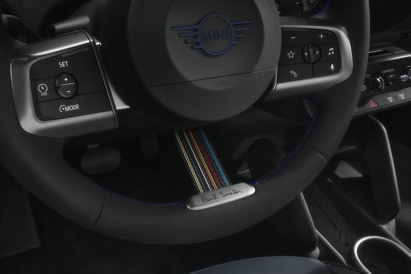 除了极具风格的配色,MINI PAUL SMITH设计师款的外观还有更多低调而考究的细节。在诺丁汉绿车顶上,作为其核心设计元素的Paul Smith经典条纹,如点睛之笔恰到好处地装饰在驾驶员一侧;另一种亮黑色车顶版本则饰以粗细不一、兼具磨砂与光泽质感的Paul Smith暗调条纹,体现出低调的质感;MINI COOPER CABRIO PAUL SMITH 设计师款则标配黑色软顶。所有车型均配备18英寸幽影黑铝合金轮毂,采用碳钢灰色调的深色涂层。诺丁汉绿的轮毂盖上标有Paul Smith手写签名,车辆前后专属炭蓝色MINI标识与后备厢把手上的Paul Smith签名上下错落,一同道明了车辆设计背后的创意灵魂。