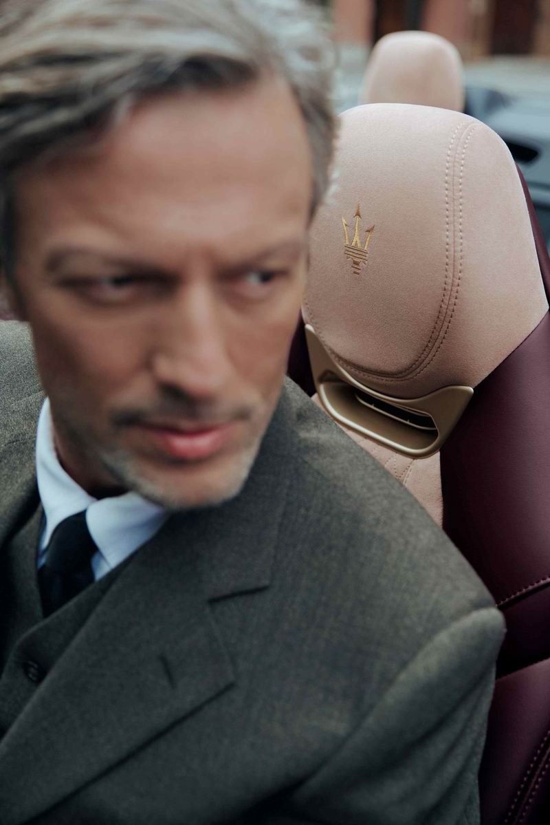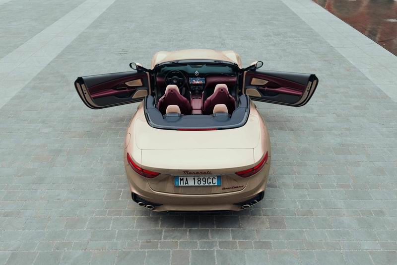 与之相对,咏叹金(Oro Lirico)配色的 GranCabrio特别版采用丝绒红(Rosso Velluto)徽章,营造出温暖而璀璨的色彩效果。车身的咏叹金(Oro Lirico)、侧徽标的哑光白金、轮毂与前脸三叉戟的白金涂装,共同构成了独特的设计语言,各元素相互呼应,实现光线与材质的和谐平衡。