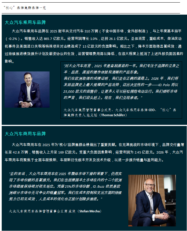 2025年大众汽车“核心”品牌集群按既定战略目标稳步推进,各项工作有序落地。尽管受不利特殊因素影响,“核心”品牌集群仍实现经营利润