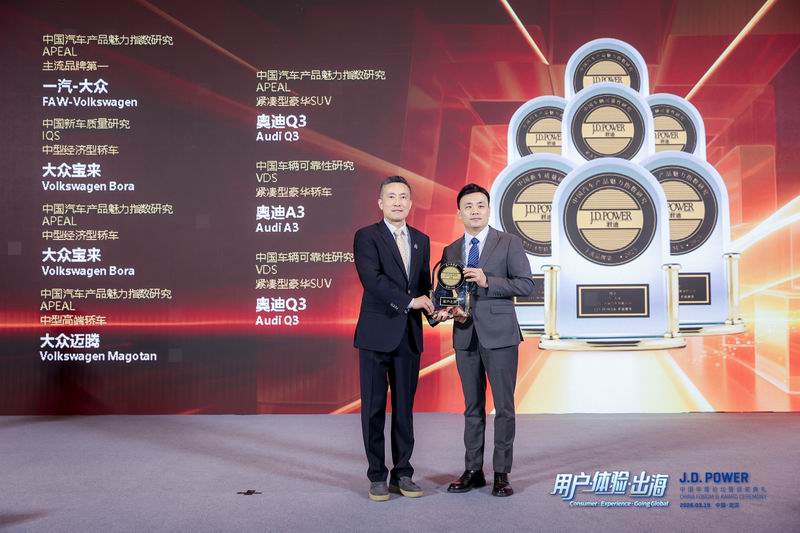 3月19日,全球领先的消费者洞察与市场研究机构J.D. Power|君迪在武汉举行2026年度论坛暨颁奖典礼,公司荣膺2025年中国三大研究七项冠军。其中,在2025中国汽车产品魅力指数研究SM(APEAL)中,公司获得主流品牌第一名,大众宝来、大众迈腾、奥迪Q3分列各细分市场魅力指数第一名;在2025中国车辆可靠性研究SM(VDS)中,奥迪A3、奥迪Q3分列紧凑型豪华轿车、SUV第一名;在2025中国新车质量研究SM(IQS)中,大众宝来获得中型经济型轿车第一名。J.D. Power作为全球领先的消费者洞察和市场研究机构,其基于真实车主反馈的奖项在行业内具有极高权威性,此次一举斩获多项研究冠军,不仅是公司卓越商品品质与可靠性的有力印证,也深刻体现了广大消费者对品牌与商品的高度认可与信赖。