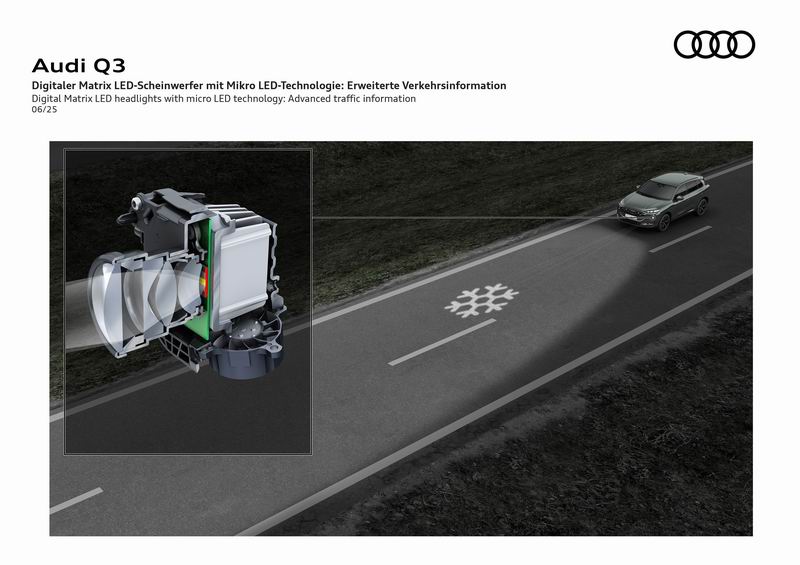 Michael Kruppa:我们刚刚讨论过的灯光数字化正是这一技术的核心。我们开发了一种光源,其原理就像一个视频投影仪。这个宽度约为13毫米的micro-LED模块,内部芯片集成了25,600个micro-LED单元,每个尺寸约为40微米,并且均可独立控制。因此,系统能够根据实际驾驶情境动态调整投射在路面上的图案。例如,车道引导灯和方位提示灯等功能现在能与驾驶辅助系统实现更紧密的联动。我们首次在紧凑级车型奥迪Q3上引入配备这种新型micro-LED技术的数字式矩阵LED大灯,从而为客户提供更高水平的安全保障。