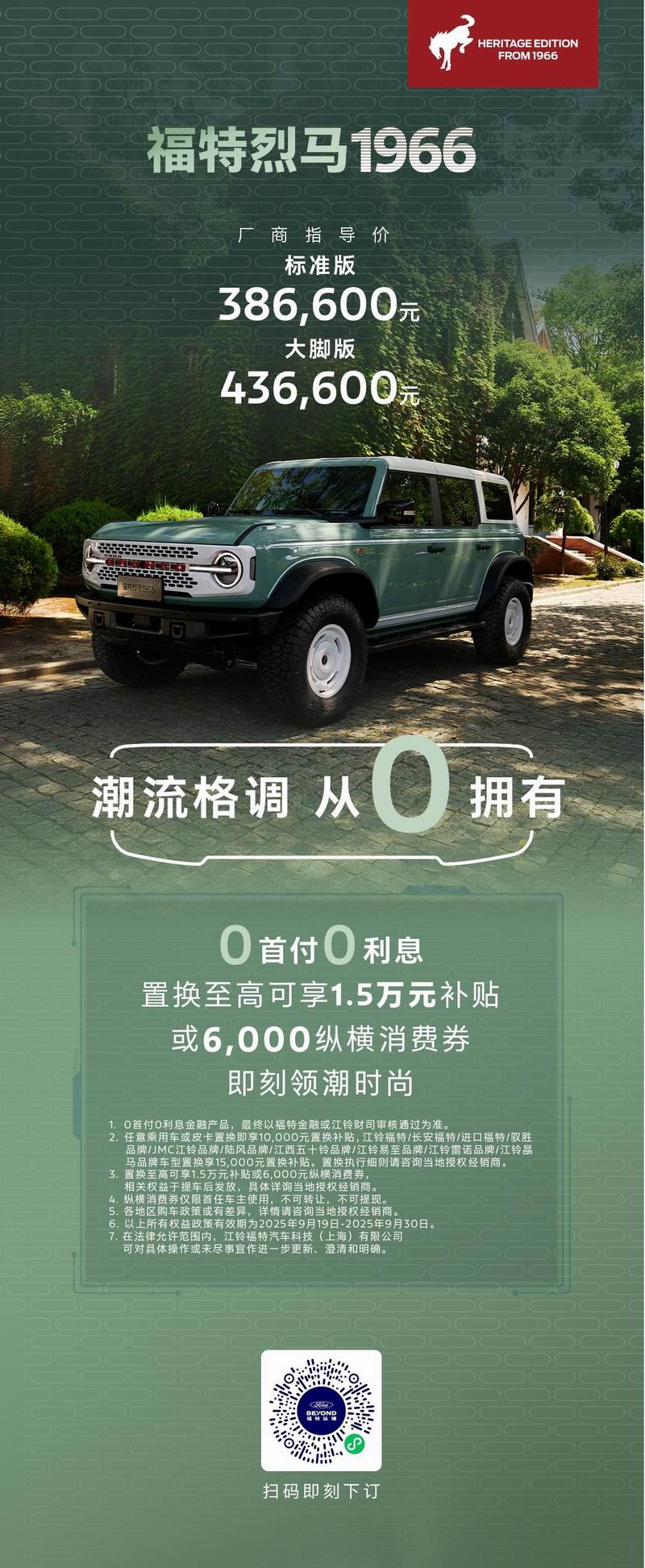 另外,9月30日前,完成烈马车主认证,分享推荐海报至朋友圈,集赞满20个后扫码上传截图即可获赠“分享集赞礼”——福特烈马限定时尚挎包1个(限量2,000个);9月30日前推荐人邀请好友扫个人推荐二维码,进行下定完成关系绑定,被推荐人于12月31日(含)前完成提车两人均可获得“推荐购车礼”(至多3人)——推荐人可获赠烈马复古折叠自行车一辆,同时推荐人与被推荐人均可获得3年3次免费基础保养。