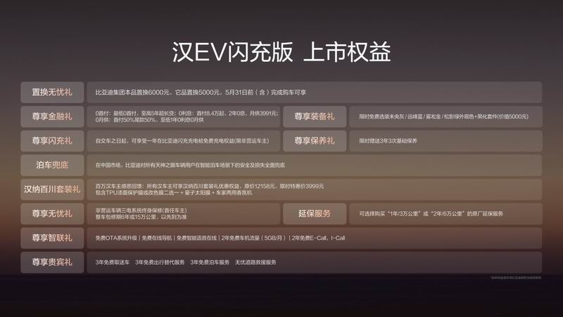 购车尊享 11 重权益,含置换礼、金融礼、3 年免费取送车等,限时 3999 元可购价值 1.2 万元 “汉纳百川” 套装。依托全国 1800 + 家服务门店,汉 EV 闪充版以技术突破与诚意定价,为百万用户带来全能旗舰新选择,树立中国品牌新能源轿车新标杆。