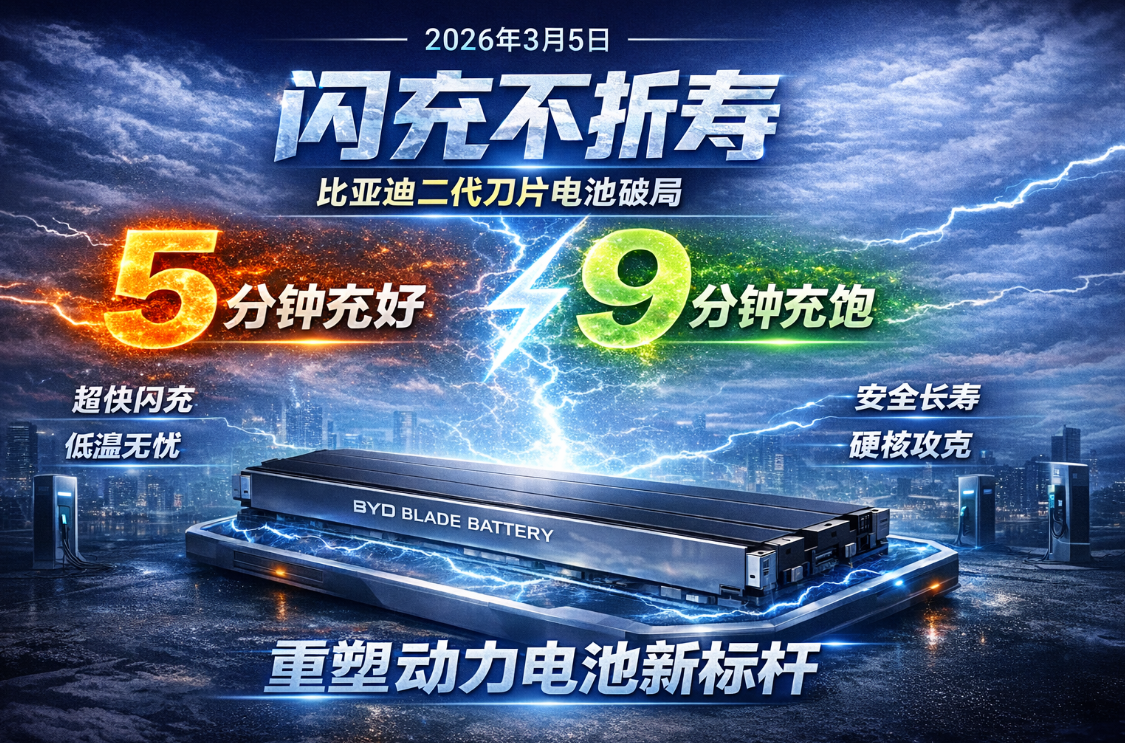 2026年3月5日,比亚迪第二代刀片电池重磅发布,以 5分钟充好、9分钟充饱 的闪充实力,攻克 充电慢、低温充...