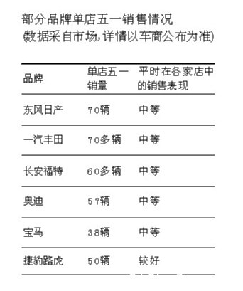 每年的五一车市都会上演促销大战,今年的硝烟味更浓,各大汽车厂家给广州经销商制定的2014年销售任务大多比去年要高,因此五一期间,车商都在加大让利力度,以期尽早卸下今年上半年的销售重担。 从各大品牌车商反馈的情况来看,五一期间有大量刚需客户入市购车,车市因此有了支撑点,南都记者走访了10多个合资品牌、豪华品牌单店,其中销量最低的店五一卖了38辆车,销量最高的店卖了73辆。好几家合资车行的负责人在采访中都提到,五一几天卖出了大半个月的量。但这些销量是用降价换来的,经营利润大受影响,因此很多车商并没有觉得五一是丰收期。