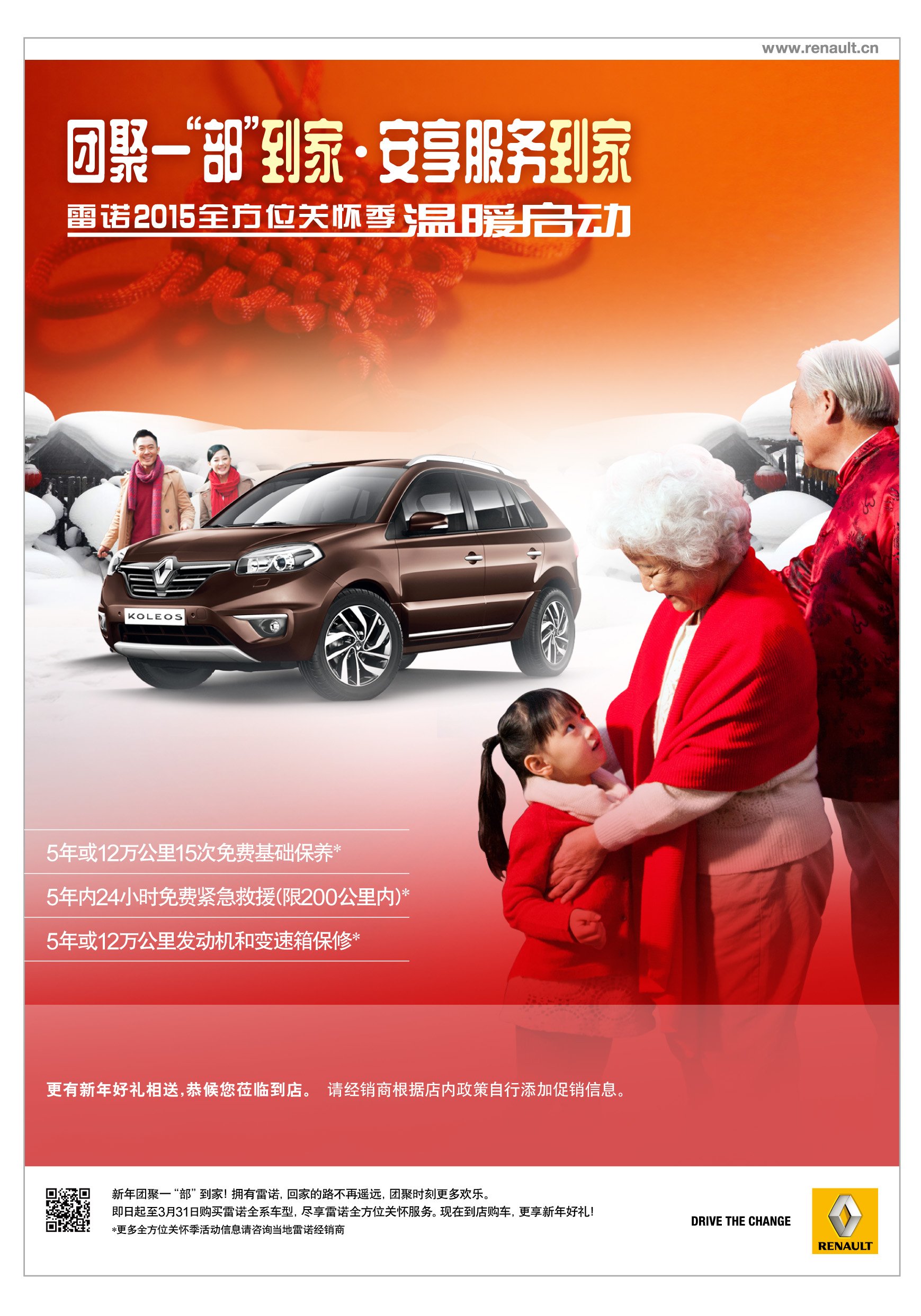 ![]() 冬日送温情 雷诺2015全方位关怀季温暖启动 1月1日至3月31日,东风雷诺温暖启动“2015全方位关怀季”活动,通过不同主题的新年礼包,带来连连惊喜: 新年红包——活动期间到店购车的消费者,即可获赠价值千元的养护礼包,内含12张保养礼券。 延长呵护——活动期间到店购买科雷傲车型,即可加赠一年基础保养,包括3次小保,1次大保。 新年炫车——活动期间,购买风朗即可获赠运动风格大包围一套,不仅让您的爱车炫出不同,还可以增加汽车的下压力,确保行驶更加平稳。 回家无忧——活动期间,购车即可获赠精品导航一套,让春节回家不再囧。 你最珍贵——活动期间,购买全系任意车型即可获赠一年全车保险。 在“服务为王”的汽车后市场,东风雷诺根据不同时令开展客户关怀活动,推出特色服务项目,让客户尽享实惠。此外,东风雷诺的全方位客户体验(TOE)服务所提供的全面保障,也让消费者真真正正享受到“用车无忧”。 除了3年或10万公里的整车保修,TOE还涵盖5年或12万公里的全系车型发动机总成和变速箱总成保修、5年或12万公里15次免费基础保养以及365天24小时全系车型免费道路紧急救援服务(包括200公里范围内电子故障或事故车免费拖车)等10余项内容。其中,进口车最长基础保养服务免费期和国内首家免费道路救援均开创了汽车行业服务新标杆。TOE不仅为爱车提供全方位保障,更倡导了一种极具时尚品位的生活方式。TOE的诺之汇车主联盟定期组织车主参加自驾游、车主聚会以及品牌和社会性活动,让车主在购车之后尽享雷诺大家庭的贴心和温暖。 享受东风雷诺新年大礼,体验东风雷诺尊贵服务!在这个寒冷的冬季,加入东风雷诺关怀季,畅享冬日出游,与东风雷诺一起度过一个温情洋溢的“暖冬”! 更多活动详情,敬请咨询当地经销商。 (责任编辑:房静) |