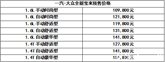 一汽-大众全新宝来全系8款车型,预售价格如下: