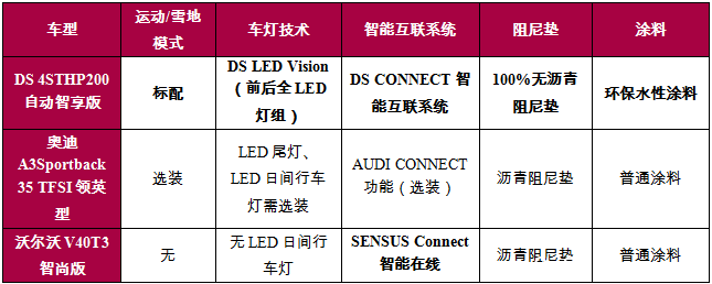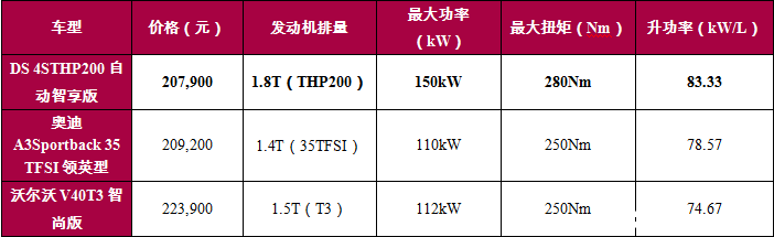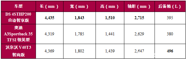 三种气质大不同,谁才是“颜值担当”? DS、奥迪和沃尔沃都是有着深厚历史的豪车品牌,设计理念却截然不同。DS作为源自法国巴黎的新世代豪华汽车品牌,前卫的设计理念始终走在时代前沿。DS 4S采用了家族式前脸“DS之翼”,细节处融合了DS Pattern组合式菱形,完美演绎了DS品牌源自巴黎的创新精神;车身线条由B柱开始倾斜,搭配一体式扰流尾翼,干净利落,充满轿跑气息;尾部造型简洁,设计圆润,双排双出的镀铬勾勒双边尾管美观大气,彰显强劲动力。 而奥迪和沃尔沃的设计理念都偏向低调沉稳。略有不同的是,奥迪A3Sportback在“沉稳”的基因之上多了一些动感气息,箭头造型前大灯、硬朗的腰线和棱角分明的尾部线条,突出了不断进取的运动风格。沃尔沃V40的外观仍然延续了简洁的北欧设计风格,低调而不张扬。 因此,从设计理念来看,三款车各有千秋。如果你倾向于前卫时尚的设计风格,那么DS 4S将会是你的不二之选;如果你喜欢低调内敛,那么奥迪A3Sportback和沃尔沃V40会是不错的选择。 有速度才有激情,谁才是“动力派”? 选车时,颜值固然重要,充沛的动力性能也是不可或缺的。同为20万元级别车型,DS 4STHP200自动智享版配备了THP200发动机+第三代爱立信6速手自一体变速箱的强势组合,发挥出150kW的最大功率和280Nm的最大扭矩,在三款同级别车型中独占鳌头,其动力性能甚至可以超越主流的2.0T发动机。此外,THP200发动机的升功率达到了83.33kW/L,展现卓越的动力性能与燃油经济性。值得一提的还有DS 4S标配的第三代爱立信6速手自一体变速箱,它经过前代的改良和进化,不仅运行流畅、反应灵敏,而且对离合器进行了优化,有效降低油耗。配合STTd智能启停系统,DS 4STHP200自动智享版百公里综合油耗仅6.6L,满足了澎湃动力与节能环保的双重需求。 奥迪A3SportbackTFSI领英型则搭载了35TFSI发动机,最大功率为110kW,最大扭矩为250Nm,升功率为78.57kW/L。沃尔沃V40T3智尚版的动力表现与之不相上下,其搭载了T3发动机,最大功率和最大扭矩分别为112kW和250Nm,升功率为74.67kW/L。 ![]() 肚里能撑船,谁才是“空间达人”? 两厢车与三厢轿车相比,具备天然的优势,即穿行都市的高度灵活性,而这也影响了两厢车的空间。那么,DS 4S、奥迪A3Sportback和沃尔沃V40这三款豪华两厢车,在空间方面的表现又如何呢? ![]() 经过对比可以看出,DS 4S在车身长宽高和轴距方面遥遥领先,打造了三款车中的最大车厢。而这也确保了乘客乘坐的舒适性,哪怕身高180cm的男子坐在后排,头部仍能留有一拳左右的空隙,腿部与前排座椅椅背之间依旧宽松自在。足够大的车身还保证了相对充足的载物空间,395L的后备箱完全可以满足普通家庭的日常需求。如果还需要放置更多的物品,也可以将座椅放倒,以获得更大、更规整的载物空间。 另外,在后备箱空间方面,表现最优秀的当属沃尔沃V40,496L的超大空间对家庭用车而言绰绰有余。但是与之形成鲜明对比的是,它的车身尺寸和轴距均不及DS 4S。可以说,沃尔沃V40的超大载物空间是牺牲乘坐空间换来的,乘坐时的局促感不可避免。而奥迪A3Sportback在空间方面表现平平。 全方位配置比拼,谁才是“科技咖”? 要获得更舒适的驾乘感受,离不开全面的科技配置,更需要绿色健康的造车材料来创造良好的车内环境。下面,同样将价格均在20万上下的DS 4S THP200自动智享版、奥迪A3Sportback 35 TFSI领英型和沃尔沃V40T3智尚版进行对比。 ![]() 通过配置列表可以发现,DS 4STHP200自动智享版配备了DS LED Vision技术,搭载LED大灯、LED日行灯、晶钻造型LED前大灯、耀目LED日间行车灯、DS pattern LED动感尾灯、LED前雾灯和LED流转式转向灯一系列全LED灯组,车辆的豪华感和科技感得到提升。其中,LED大灯、LED日行灯为DS 4S全系标配,这在同级车中非常罕见。同时,DS 4STHP200自动智享版还配备了具有VR(Voice Recognize)人机对话功能的DS CONNECT智能互联系统,用户可以通过简单的指令与系统进行沟通。DS CONNECT的另一大亮点就是搭载了24小时人工呼叫平台,用户随时随地都可以通过人工对话,享受目的地查询、附近生活推荐、车况诊断等服务。此外,DS 4S采用第三代爱信六速手自一体变速器,支持运动/雪地模式,提供了“普通”、“雪地”、“运动”、“ESP OFF”四种模式切换,有效提升行车安全度。 相对而言,奥迪A3Sportback 35 TFSI领英型和沃尔沃V40T3智尚版的科技配置略逊一筹。驾驶模式方面,奥迪A3Sportback 35 TFSI领英型只能选装奥迪驾驶模式选择系统,沃尔沃V40T3智尚版则无此选项;车灯技术方面,两款车均未配备前后全LED灯组,科技感和美观度稍显不足;智能互联系统方面,奥迪A3Sportback 35 TFSI领英型只能选装AUDI CONNECT功能,而沃尔沃V40T3智尚版则标配SENSUS Connect智能在线系统,同时具备人机沟通功能。 另外,DS 4S延续了DS一贯的健康造车理念,全车系采用PVC材料和丁基橡胶替代沥青制作阻尼垫,车内外均采用水性环保涂料,即使是刚下线的新车也没有异味。而奥迪A3Sportback和沃尔沃V40仍然使用沥青阻尼垫和普通涂料,无法保障车内空气的洁净。 综合点评:DS 4S、奥迪A3Sportback和沃尔沃V40三款车的外观见仁见智,各有千秋。空间上则是DS 4S占据优势,其车身尺寸最大,后备箱空间也足够使用。而同样是在20万左右的价位下,DS 4S THP200自动智享版的动力和科技配置都比奥迪A3Sportback 35 TFSI领英型和沃尔沃V40T3智尚版更胜一筹。另外,DS 4S的健康造车理念也为