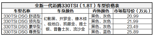 除此之外,全新一代迈腾1.8TSI领先型还增加了集控式三幅真皮多功能方向盘、GRA定速巡航系统、外后视镜电动折叠及6.5英寸触摸彩屏,以及前排座椅12向电动调节等对消费者吸引力很大的一系列配置,而加在一起的成本肯定超过了与舒适型相差的1万元,可谓真正做到了物超所值。