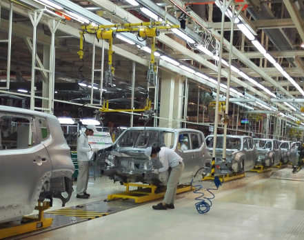 焊装车间共有440台机器人,实现了100%自动化焊接。总拼工位合成了18台新一代中空腕机器人同时焊接,可以在节拍时间内完成150个焊点,并具备节拍内6款车型的100%柔性生产能力。