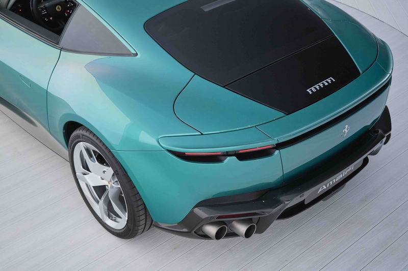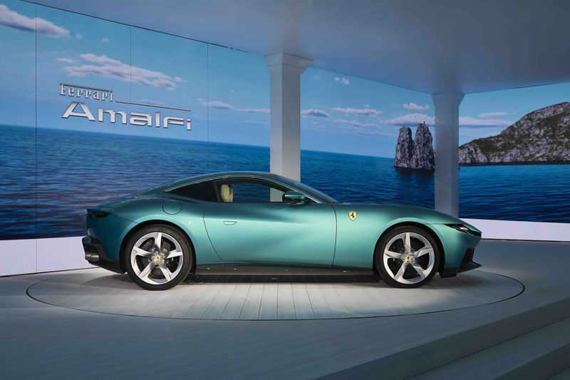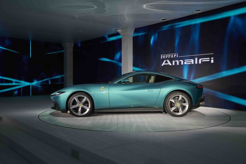 法拉利Amalfi 的外观设计灵感源自Speedform项目车型浑然一体的流线造型,赋予整车蓄势待发的动感姿态。新车的车身型面秉持纯粹至简的设计理念,利落的线条与充满几何美感的轮廓相得益彰,共同勾勒出富有雕塑美感的流畅车身。新车前脸摒弃了传统的格栅设计,转而在深色的凹条上方布局一个与车身同色的悬浮式前翼,而大尺寸进气口与修长立体的发动机罩构成了新车前部的视觉焦点。车尾则由一条醒目的线条环绕,勾勒出干净利落、简约凝练的轮廓。此外,锻造轮毂与碳纤维细节则为整车造型增添一抹动感气息与精致美感。为彰显独特个性,新车的首发配色Verde Costiera以阿马尔菲海岸的粼粼波光为灵感,这一闪耀的蓝绿色调在车身型面上流转,既强化了雕塑美感,又为整车设计注入充满活力的灵动气息。