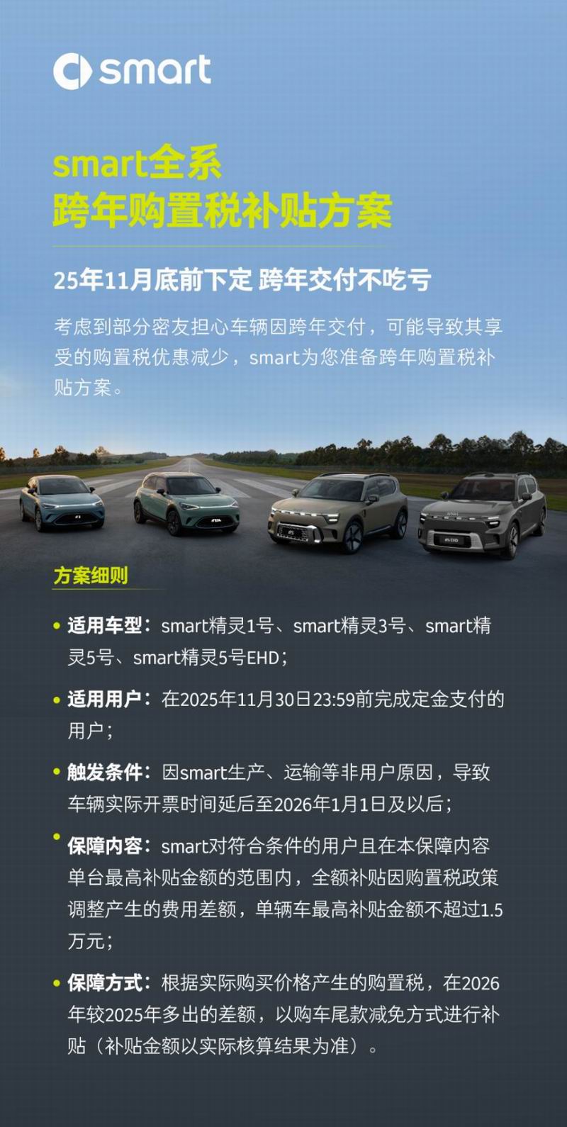 即日起,选购smart #1、#3、#5、#5 EHD超级电混车型,并在2025年11月30日(含)前完成定金支付的用户,如因非用户原因导致车辆实际开票时间延后至2026年1月1日及以后的,smart将在最高额补贴范围内全额补贴因购置税政策调整产生的费用差额,单辆车最高补贴金额不超过1.5万元。