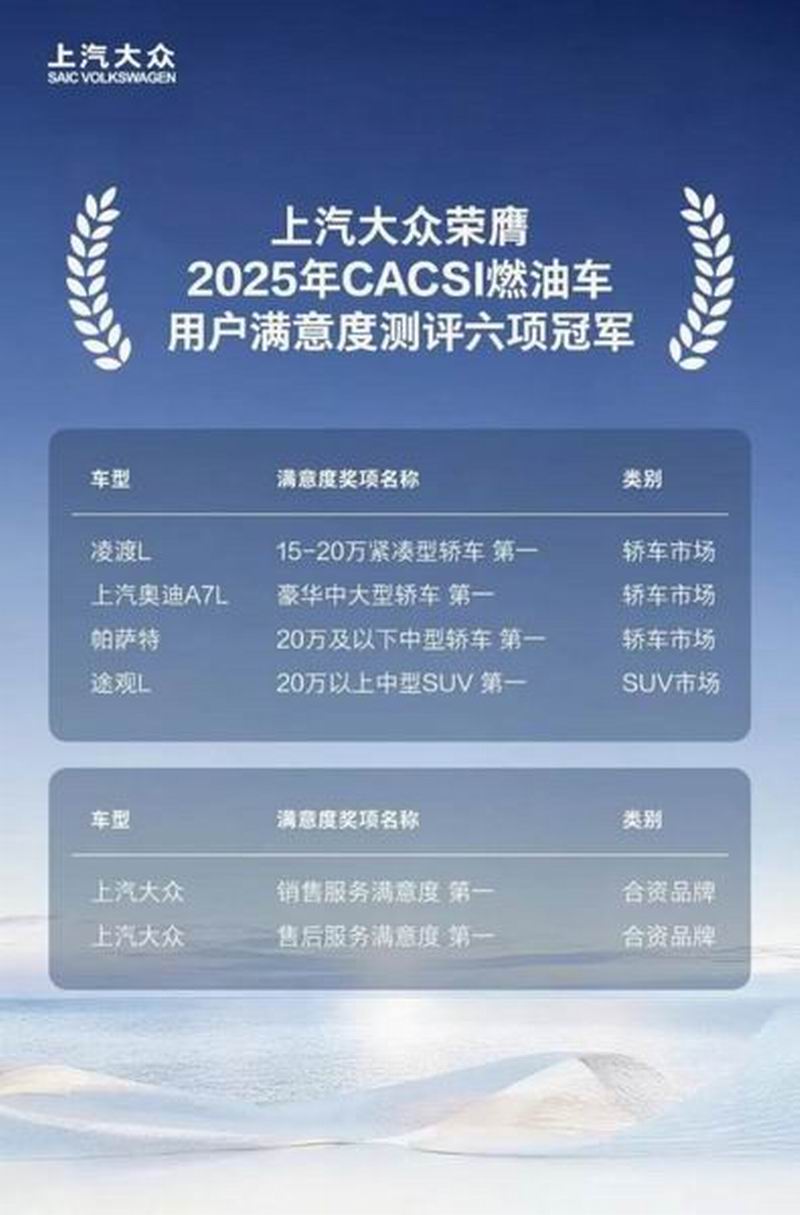 在2025“服务质量年”,上汽大众通过广泛收集用户声音、推动服务数字化转型等举措,强化直连用户,优化全生命周期体验。大众品牌推出“一客一群”数字化专属服务模式、行业领先的“整车终身质保”政策、透明的“一口价”购车方案,带给用户全流程的省心、放心与安心。高品质服务收获用户口碑。在2025年的CACSI测评(中国汽车行业用户满意度指数)中,上汽大众大众品牌荣获合资品牌销售服务与售后服务双料冠军。