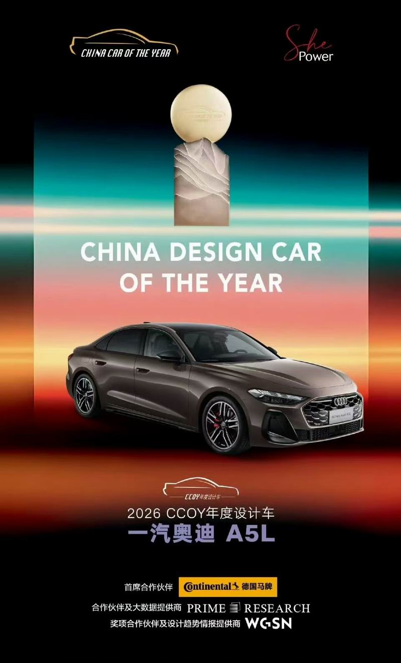 奥迪A5L获评“2026 CCOY年度设计车”称号——这是中国汽车界最具声望的年度奖项之一,由权威行业媒体专家评审团评选产生。奥迪A5L深度契合新时代中国用户对出行的审美与功能需求,将美学、科技与人性化体验深度融合,持续推动汽车设计开拓全新疆界。