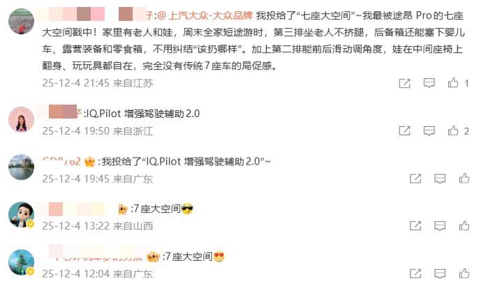在评选互动中,“七座大空间”与“IQ.Pilot增强驾驶辅助2.0”成为网友投票关注的两大焦点。不少用户留言支持途昂 Pro的大空间:“家里有老人和小孩,周末全家出游时,第三排坐老人不挤腿,后备箱还能放下婴儿车、露营装备,不用再纠结该扔哪样。”同时,IQ.Pilot增强驾驶辅助系统2.0凭借“实时感知路况,人机共驾更安心”的出色体验,获得大量网友的选择,成为高票人气配置之一。真实用户的声音,印证了途昂 Pro在实用与科技感层面的双重吸引力。