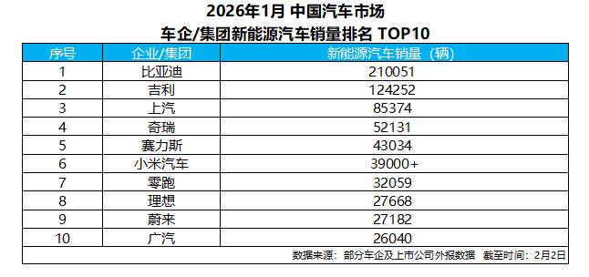 新年伊始,2026年1月新能源汽车销量榜单尘埃落定,比亚迪以绝对优势再度登顶,用210051辆的亮眼成绩,为全年竞争定下领跑基调,也再度印证了其在新能源赛道的绝对统治力。头部车企之间的差距进一步拉开,