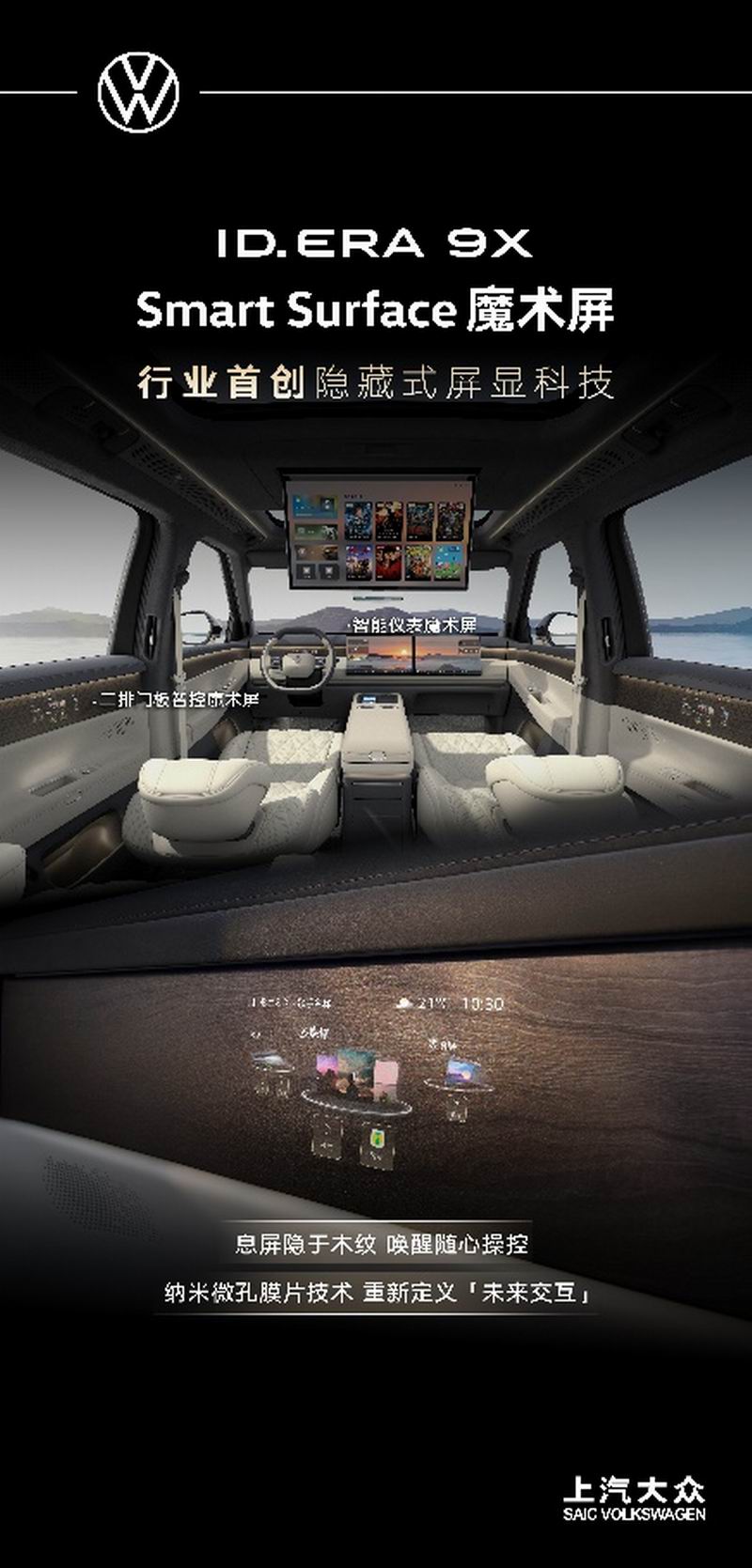 科技隐于无形,关怀触手可及。ID. ERA 9X首次搭载行业领先的Smart Surface魔术屏技术,重新定义人车交互的视觉美学与实用逻辑。其采用微孔膜片工艺,在屏幕关闭时与内饰材质完美融合,实现“只见材质不见屏幕”的隐形式美感;点亮后画面清晰通透,无纹理干扰,兼顾科技感与整体感。