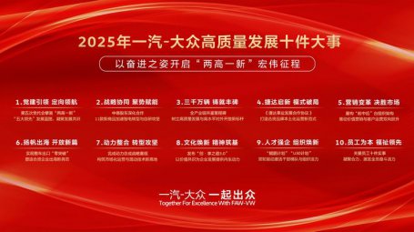 回望2025年,一汽-大众秉持产业报国初心,勇担央企合资企业使命,实现了稳健经营与高质量发展。站在十四五与十五五交汇的历史节点,一汽-大众以十件大事为笔,擘画了面向未来的崭新蓝图,为企业长远发展筑牢了坚定基石。 1 、党建引领,定向领航第五次党代会擘画两高一...