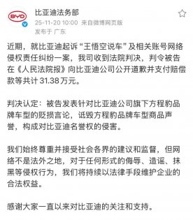 近日,比亚迪起诉自媒体账号王悟空说车及相关主体网络侵权责任纠纷一案尘埃落定。11月20日,比亚迪法务部发布公告披露,法院经审理认定,被告发表针对比亚迪旗下方程豹品牌车型的贬损言论,已构成对企业名誉权的侵害,最终判决被告需向比亚迪公开赔礼道歉,并支付共计31...