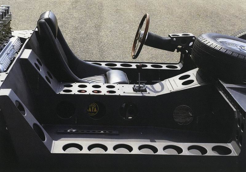 这副底盘的独特之处在于发动机与变速箱以前所未有的形式集成于座舱后方的紧凑动力单元。这种解决方案缩小了尺寸,定义了全新的动力系统架构。Weber化油器的十二支垂直进气喉管更成为点睛之笔,以极具冲击力的视觉语言宣告工程理念的极致演绎。