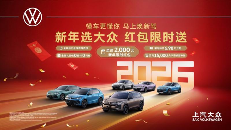 新年选大众,红包限时送。2025年,上汽大众大众品牌凭借出众产品力与用户口碑,全年累计销量继续稳居年销百万俱乐部。新年之际,为回馈用户厚爱,上汽大众送出惊喜购车礼。即日起至2026年1月31日,用户购买上汽大众燃油车,就有机会享受至高2,000元新年限时红包、全系动力总成终身质保、限时特价6.98万元起、金融礼至低0首付0利息、至高15,000元以旧换新补贴等福利,限时限量,先到先得。(*详情请洽当地经销商)