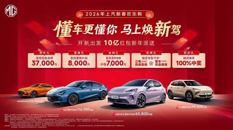延续2025年的热销势头,MG在开年即推出“10亿红包”大规模用户回馈活动,有力彰显了品牌把握市场节奏的信心与持续乘势而上的决心。2026年,MG将陆续投放多款新能源车型,以技术为基、用户为本,继续完善产品矩阵,稳步推进品牌在智电时代的全面焕新与向上突破。