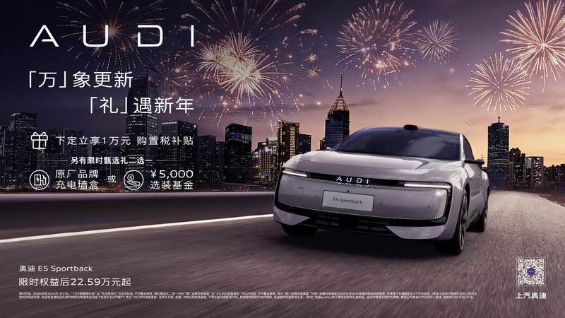 2026年1月7日,上海 – 新年伊始,上汽集团正式启动“懂车更懂你,马上焕新驾——2026上汽新春欢乐购”。上汽奥迪同步推出新年购车礼遇:即日起至2026年1月31日,用户购买奥迪 E5 Sportback立享10,000元购置税补贴,另可获赠原厂品牌充电墙盒(含安装)或尊享5,000元选装基金。先锋体验与专属礼遇相随,奥迪 E5 Sportback伴您从容启新,驭电向前。