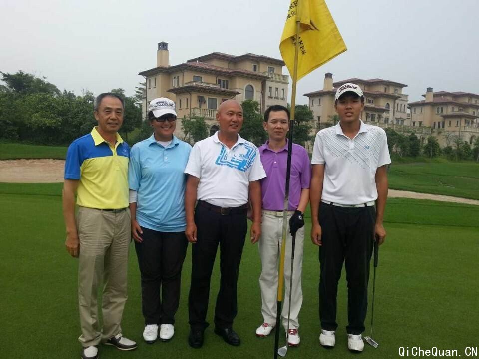 2014宝马杯云东海高尔夫花园球队争霸赛首位“一杆进洞”奖得主董宏先生(中)与嘉宾合影