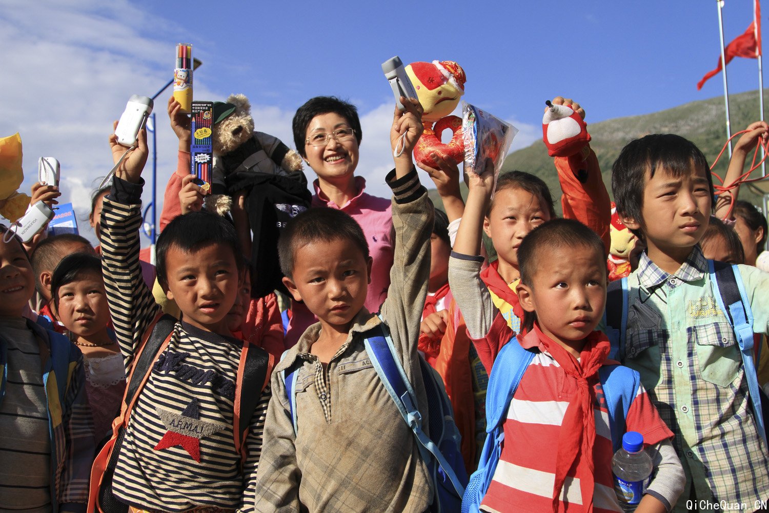 大众汽车集团(中国)副总裁杨美虹女士为在灰街子儿童安全驿站活动的孩子们分发礼品