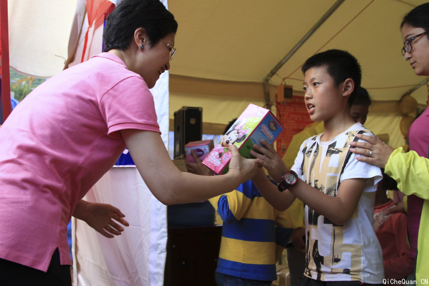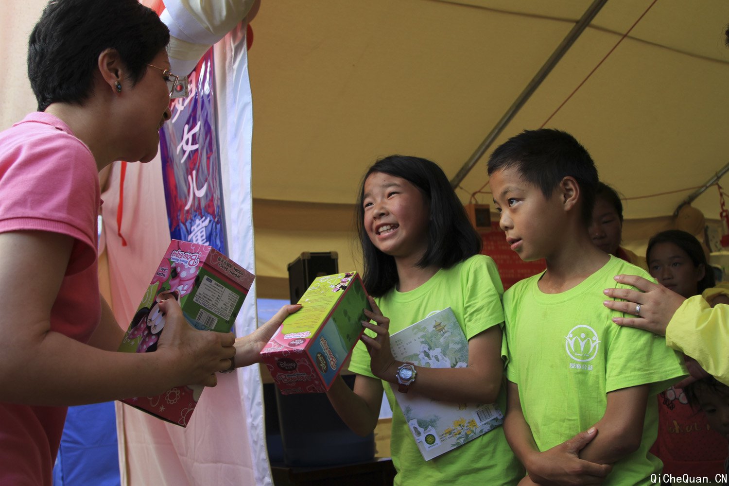 大众汽车集团(中国)副总裁杨美虹女士为在骡马口儿童安全驿站活动的孩子们分发礼品