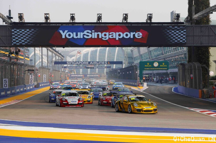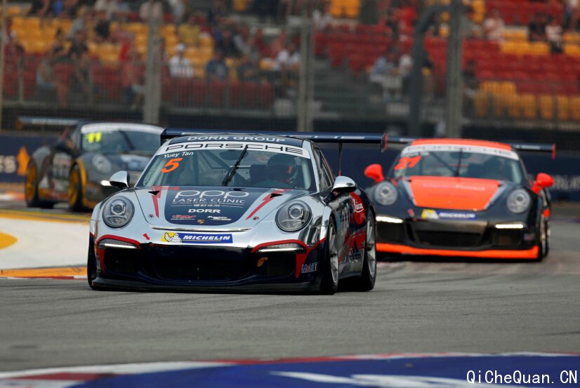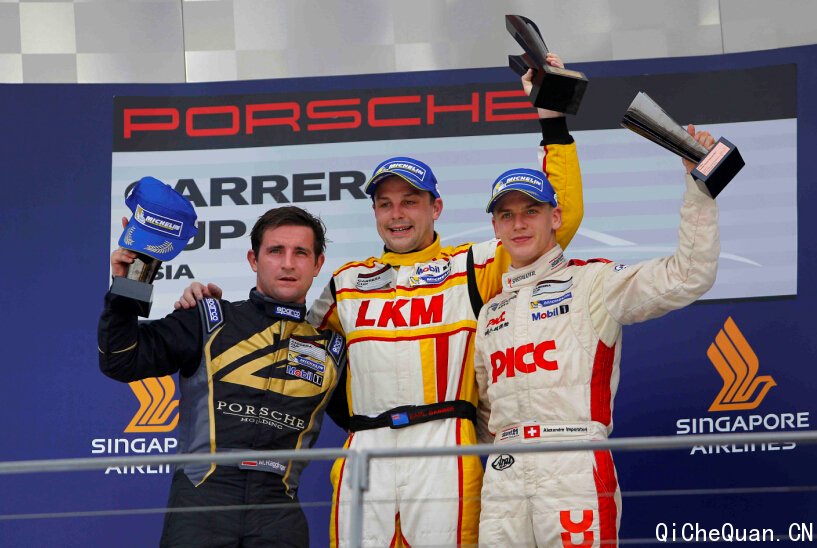亚洲保时捷卡雷拉杯第十回合今天在新加坡滨海湾赛道举行,领先2014总积分榜的卫冕冠军班博(Earl Bamber)驾驶着LKM Racing的Porsche 911 GT3 Cup赛车,从第六排发车,成功击退Team Porsche Holding的马丁(Martin Ragginger)和PICC追星车队的杆位车手亚历山大(Alexandre Imperatori),以4.8秒的优势首名撞线,夺得个人在新加坡的第二冠。