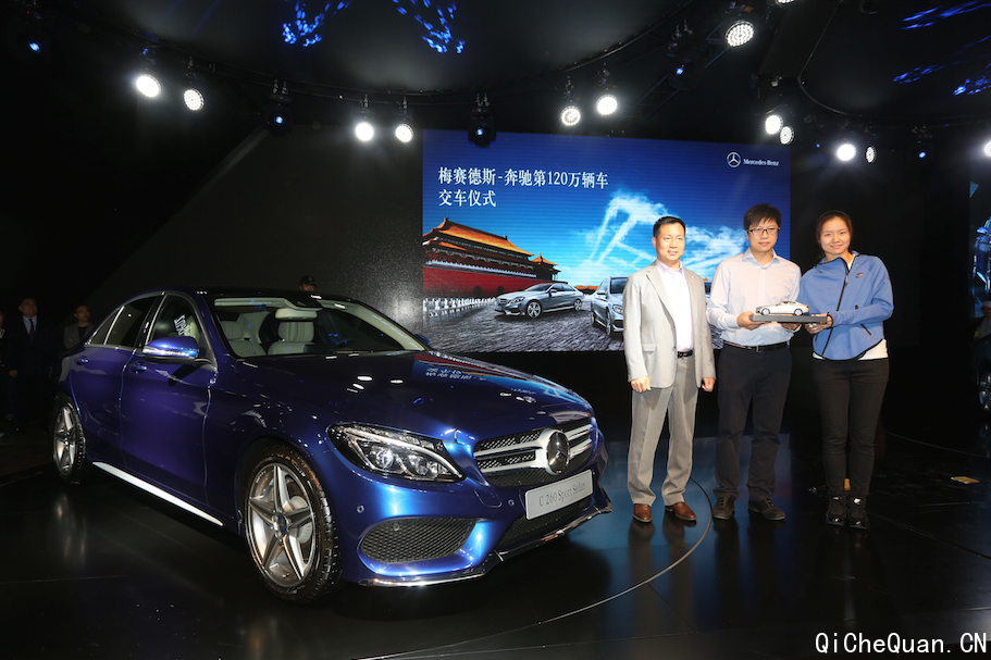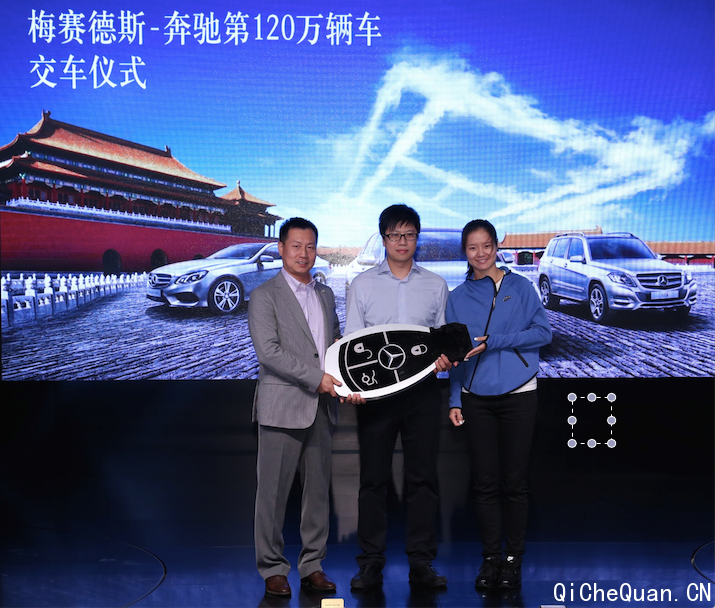 北京梅赛德斯-奔驰销售服务有限公司高级执行副总裁李宏鹏先生与梅赛德斯-奔驰全球使者李娜一同将一辆全新长轴距C级车交到第120万辆车主手中
