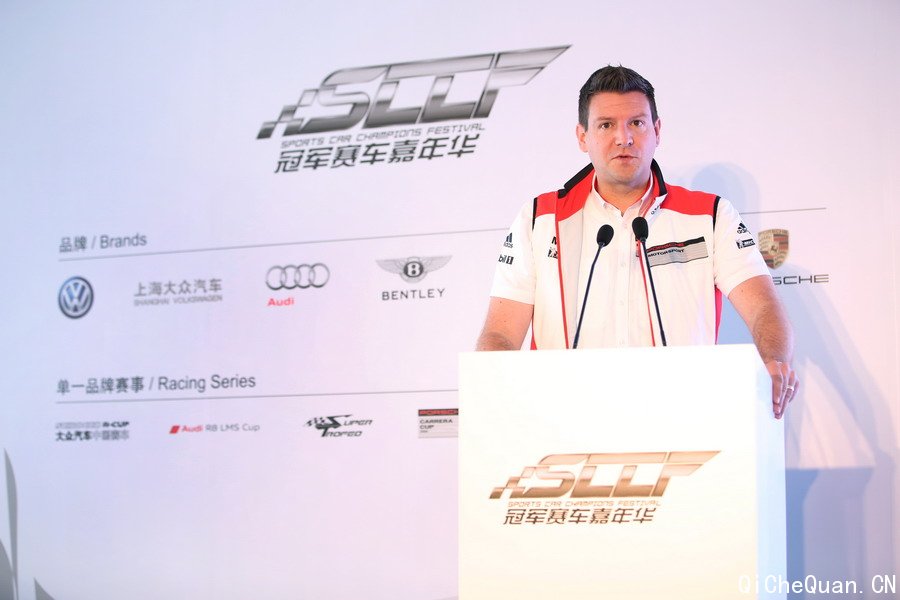 Porsche全球赛事新闻部负责人雨傲伟先生在2014冠军赛车嘉年华发布会上发言