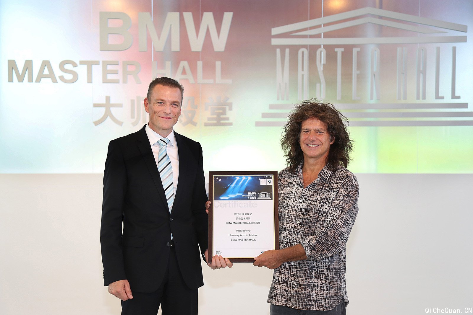 华晨宝马汽车有限公司营销高级副总裁万博瑞先生为爵士吉他大师派特-玛希尼先生颁发“BMW大师殿堂”荣誉艺术顾问证书