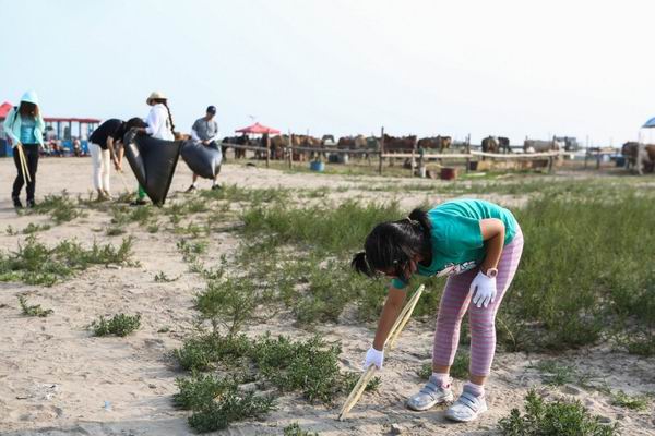 次日丰富多彩的草原活动让大家体验了蒙古特色文化,从此懂得它的生生不息源自草原的养育和自然的恩赐。活动尾声,42位志愿者拿起垃圾夹,不畏风沙及尘土,自愿发起绿色行动:在马场捡拾游客丢弃的垃圾,重还草原一片干净绿意,为草原保留生命的源泉,带走垃圾,只留温情和回忆。