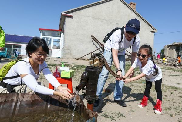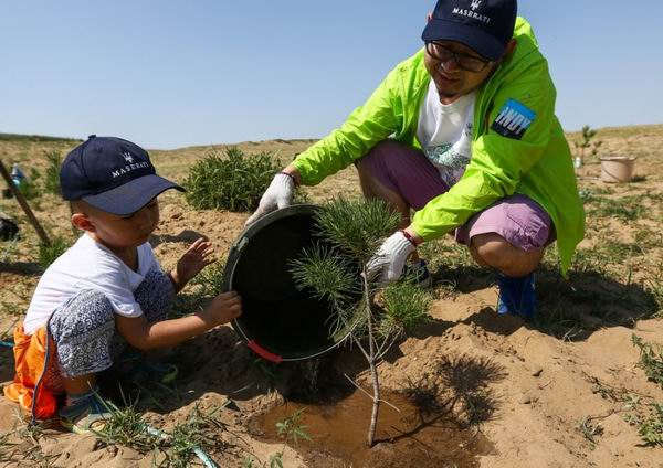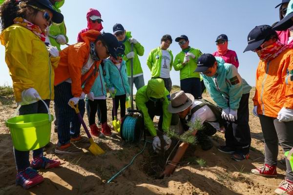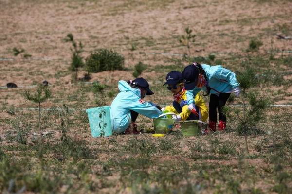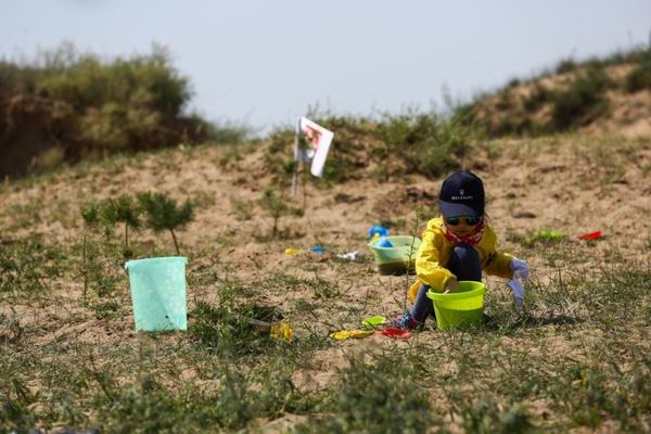 小朋友与父母一起,顶着烈日,搬运树苗,拉线测距,握锹挖坑,插苗浇水,虽然动作略显稚嫩,但专注认真,全情投入。家长们纷纷表示:“生活在都市的孩子少有机会进入荒漠,更别说在风大、缺水、黄沙漫天的环境下植树。这样的经历不仅帮助孩子们提高保护自然环境的环保意识,更让他们学会感恩和珍惜。”