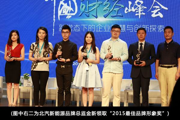 2015年7月22日,第四届中国财经峰会在北京如期举行,北汽新能源荣获“2015最佳品牌形象奖”,北汽新能源党委书记、总经理郑刚获得“2015(行业)最具影响力人物”奖,北汽新能源“壁咚”两项大奖成为最大赢家,一时间引“无数路人竟折腰”。