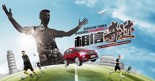 作为国际米兰足球俱乐部官方合作伙伴,源自意大利的SWM斯威汽车于近期推出了“相信奇迹——意甲狂欢直飞看国米,全民竞猜得SWM斯威X7”有奖竞猜活动,让球迷们可以一圆现场看球梦。参与2017-2018赛季意甲联赛国际米兰比赛有奖竞猜,不仅有机会赢取往返机票直飞意大利现场看球,甚至有机会获取国际米兰110周年纪念版SWM斯威X7的终极大奖。