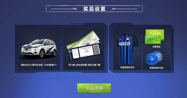 月度积分最高的球迷可以获得定制版国米球衣、定制版国米足球、手机话费等奖品,半程大奖则是国米球迷们最期待的意大利往返机票和国际米兰观赛门票,获奖得主可以直飞意大利现场观赛。在2017-2018赛季意甲联赛结束后,积分最高的球迷则可免费获得SWM斯威汽车与国际米兰足球俱乐部合作的国际米兰110周年纪念版SWM斯威X7一部。