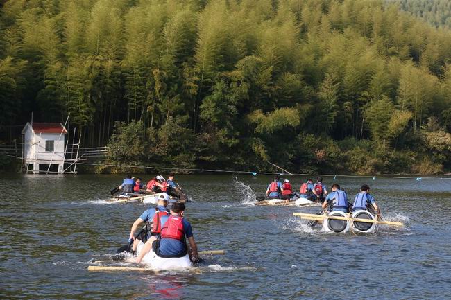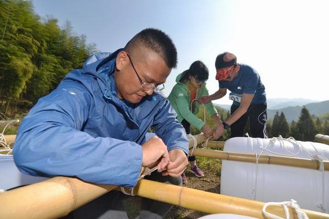穿越竹海后,选手们在莫干山水库边迎来了烧脑的扎筏泅渡比赛。在规定的40分钟时间里,每组选手要设计并捆扎出足以保证他们完成泅渡任务的竹筏。富有趣味的挑战激发了他们的潜能,每组选手尽显才华,充分发挥奇思妙想,设计制作的竹筏风格迥异,在争分多秒的计时赛中各显神通。