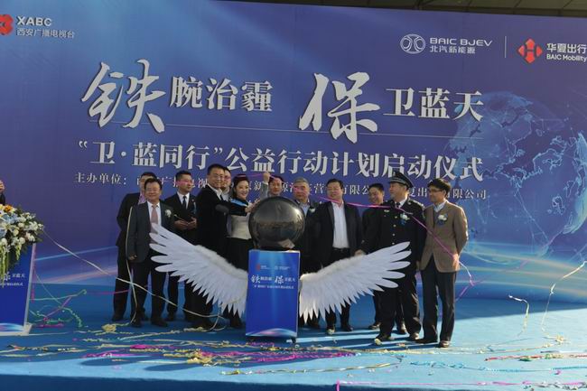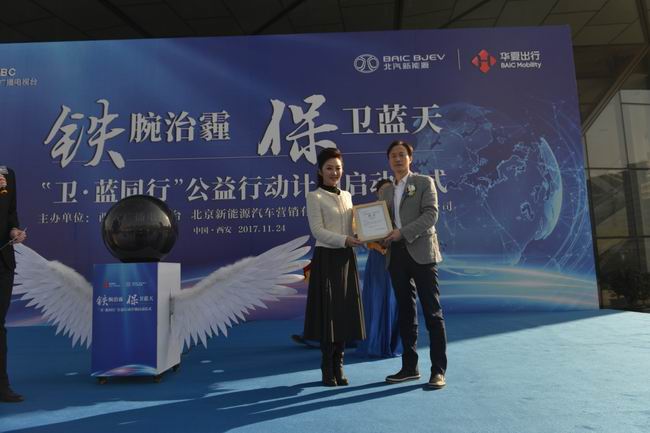 2017年11月24日上午,由北京新能源汽车营销有限公司联合西安广播电视台和华夏出行有限公司,在西安广播电视台西广场共同启动了 “卫·蓝同行”公益行动计划。本次公益行动计划将面向全社会征集具有低碳环保理想的人士,共同以实际行动来影响身边更多的人加入保卫蓝天的行列,倡导绿色出行,驾乘完全无污染的纯电动汽车作为市区代步工具。北汽新能源还特别设立了卫蓝公益基金,以更优价格享受到纯电动汽车的绿色生活。仪式上,西安电视台主持人孙维正式受聘为北汽新能源“卫蓝大使”,并获赠北汽新能源EU260纯电动汽车,今后她将以实际行动为推广绿色出行理念摇旗呐喊。同时,北京新能源还向华夏出行交付首批投放于西安市场的共享新能源汽车,为西安市民出行带来全新的选择。