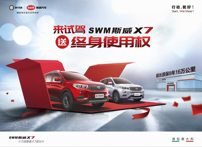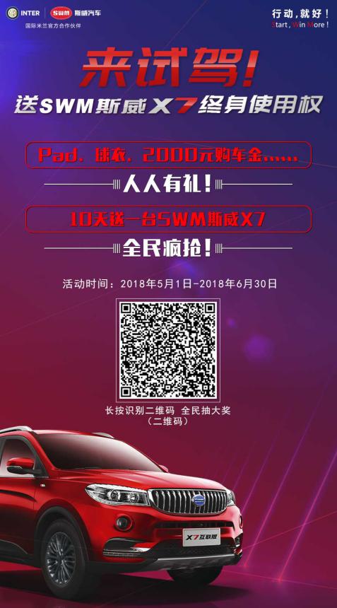 生活中中奖的那一刻,与球场上得分的那一刻同样让人热血沸腾! 5月,SWM斯威汽车宣布开启壕气冲天的“来试驾!送SWM斯威X7终身使用权”活动,为什么说这是一场“壕气”的活动呢?因为这场活动的主要目的就是“送送送”,各种福利,送到手软!