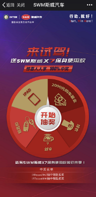 在活动第一轮的“幸运大转盘”抽奖环节中,SWM斯威汽车准备了 IPAD、水杯、球衣、钥匙扣、2000/1000购车基金等多重福利大奖!你可能从小到大都“脸黑”,再来一瓶都没有中过,但在“来试驾!送SWM斯威X7终身使用权”活动中,你拥有100%的中奖几率!只要参与就一定会中奖,幸福来得就是这么突然!