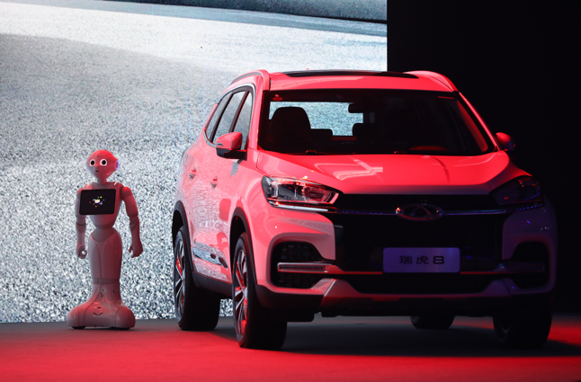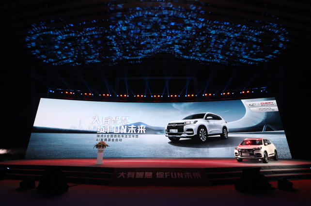 再往里走,是瑞虎8交车活动的主舞台,主舞台上一台瑞虎8和一个智能机器人并排站在一起,科技范十足!