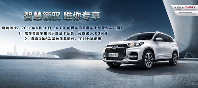 奇瑞将为6月30日前提车的用户提供尊荣购车礼遇:1、成为奇瑞车主俱乐部金卡会员,另赠送5000积分;2、尊享3年6次基础保养配件、工时七折优惠。
