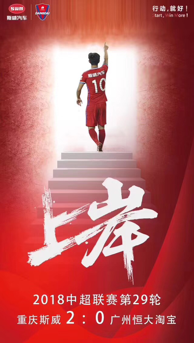 而在赛后第一时间,重庆斯威足球队冠名赞助商SWM斯威汽车也发布了庆祝海报。
