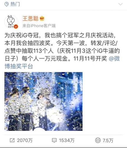 11月6日,王思聪为庆祝IG夺冠,发起第一波抽奖,抽取转发此微博的113人,一人送一万元,双十一那天开奖。于是,王校长靠着自己非比寻常(吃热狗)的人格魅力,一夜之间转发量破千万。不仅成功回怼英雄联盟失败运营,还再次引发微博抽奖狂欢,传播上看,可以说这113万奖金带来的效果完胜支付宝独宠的中国锦鲤。
