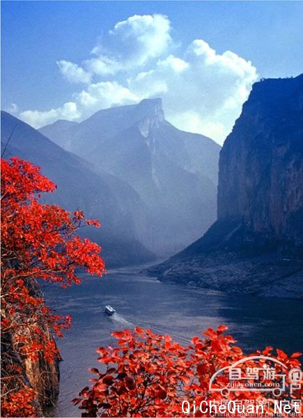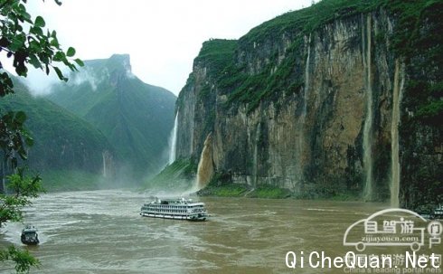 长江,奔腾咆哮,一进峡谷便遇到气势赫赫的夔门。夔门两岸的高峰,陡削如壁,耸立在岸边,将奔腾大江逼成一条丝带,盘旋蜿蜒在深谷间。这是宽敞的河河宽只有一、二百米,最窄的地方也不过是几十米的距离;但是两岸山峰高达已经达到1000-1500米。这里峡深水急的江流,绵延不断的山峦,构成了一幅极为壮丽的画卷。